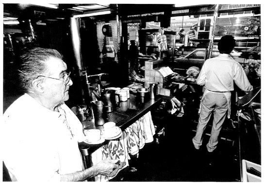 Though the cafe was partially re-modelled in the late 40s (Pellicci's astonishing interior marquetry dates from the early twentieth century), the authoritative steel logo over the front door and the classic primrose-colour Vitrolite exterior panels signal a potent authenticity. Pellicci's boasts possibly the best personal service of any eaterie in Britain. Pellicci's HAS to be seen to be believed. As of Feb 2005 it's been Grade II listed by English Heritage, one of only two twentieth century cafes to be so protected (the other one is Alfredo's - now S&M Restaurant.)