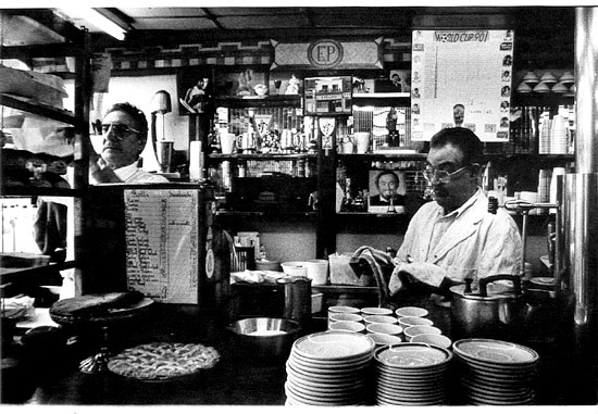 Though the cafe was partially re-modelled in the late 40s (Pellicci's astonishing interior marquetry dates from the early twentieth century), the authoritative steel logo over the front door and the classic primrose-colour Vitrolite exterior panels signal a potent authenticity. Pellicci's boasts possibly the best personal service of any eaterie in Britain. Pellicci's HAS to be seen to be believed. As of Feb 2005 it's been Grade II listed by English Heritage, one of only two twentieth century cafes to be so protected (the other one is Alfredo's - now S&M Restaurant.)