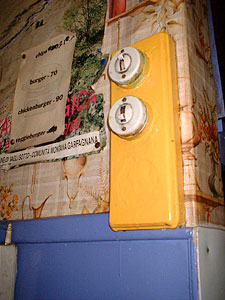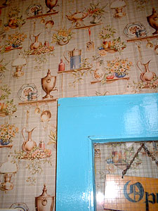 sign, net curtains and inside an amazing worn old wallpaper-patterned