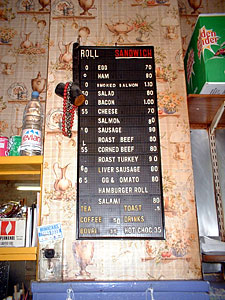 interior: a parlour full of old Formica tables, worn Lino flooring